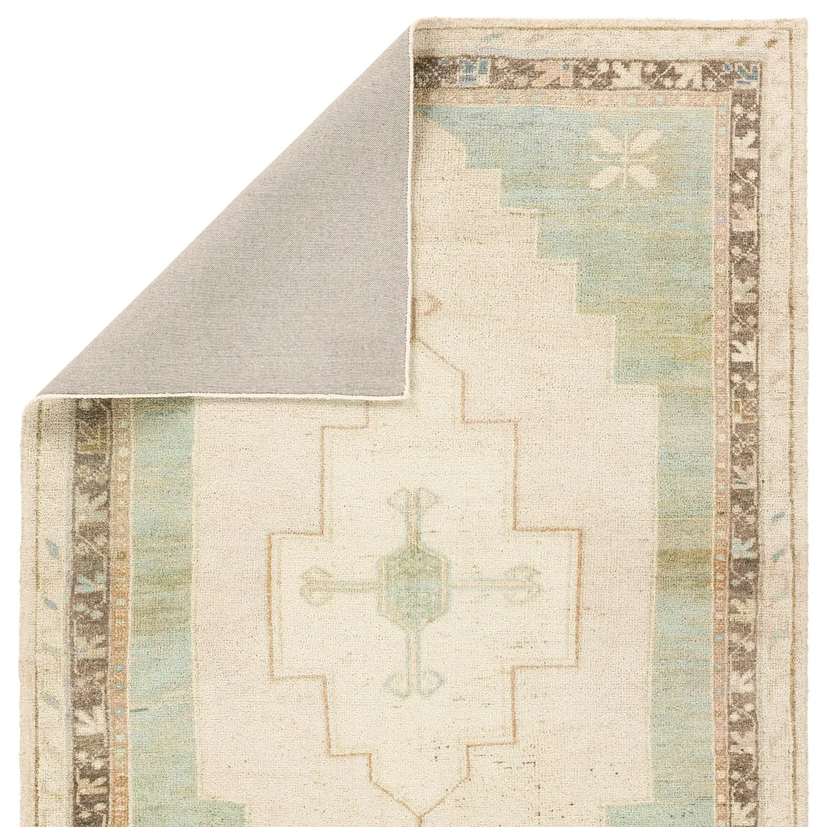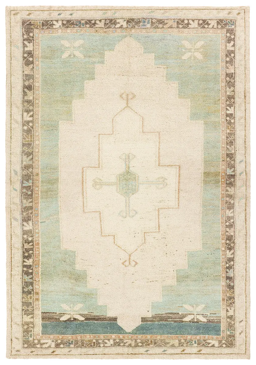 The Adorn design features a traditional medallion motif, set against a warm tan and beige backdrop with subtle accents. Its vintage, distressed look adds character and charm, making it feel like a cherished heirloom from the very first step.